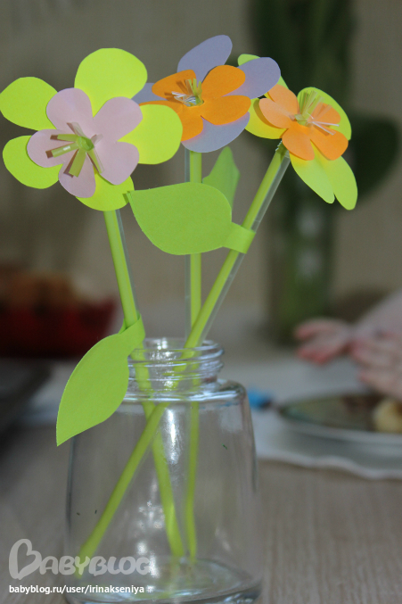 Сотворили мы вместе с Ксеней такой маленький весенний букетик из соломинок и цветочков из бумаги, идею увидела в интернете, и