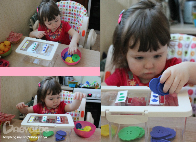 В контейнере три отверстия, возле каждого картинка на которой указано какие пуговки можно положить в данное отверстие.