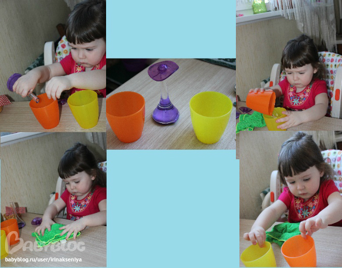 Ксения налила по-немногу воды, часть пролила, затем вытерла и продолжила игру с переливанием, натренировалась до того, что водичка уже перестала проливаться))и в итоге как и нужно было налила в два стаканчика и сказала: Все, спасибо)))