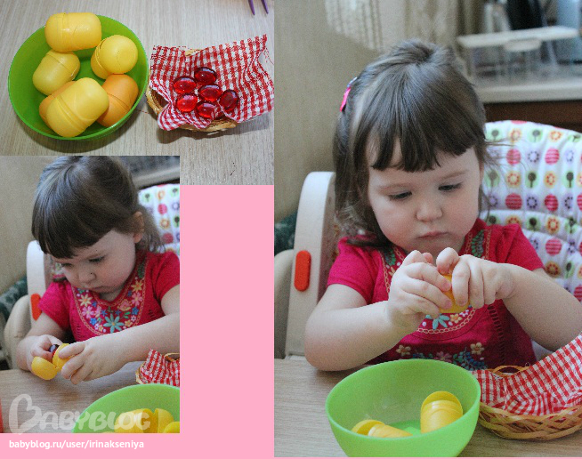 Ксения в два киндера сложила все камни и сидит довольная, а когда послушала, поняла, что надо было чтобы во всех яичках