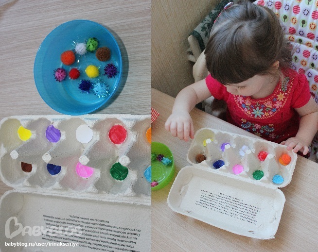 В кассету из под яиц сложить все помпоны, цвет помпона соответствует цвету в ячейке.