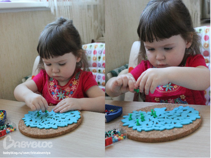 Одни кнопки Ксения откинула, взяла те, которые по удобнее вставлять. Кнопочки старалсь брать тремя пальчиками, разрабатывая "пинцетный захват"