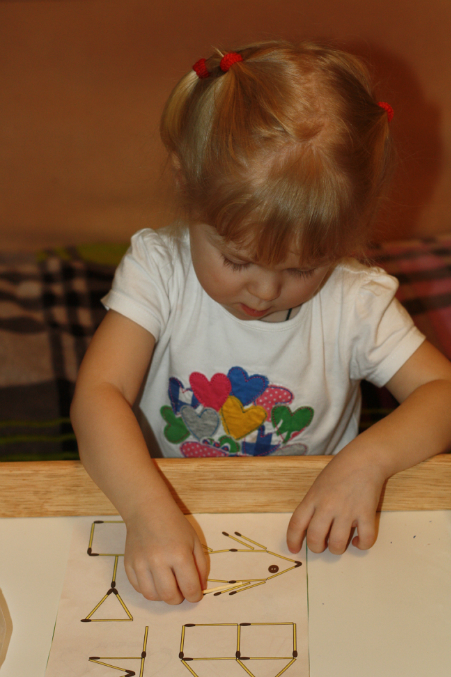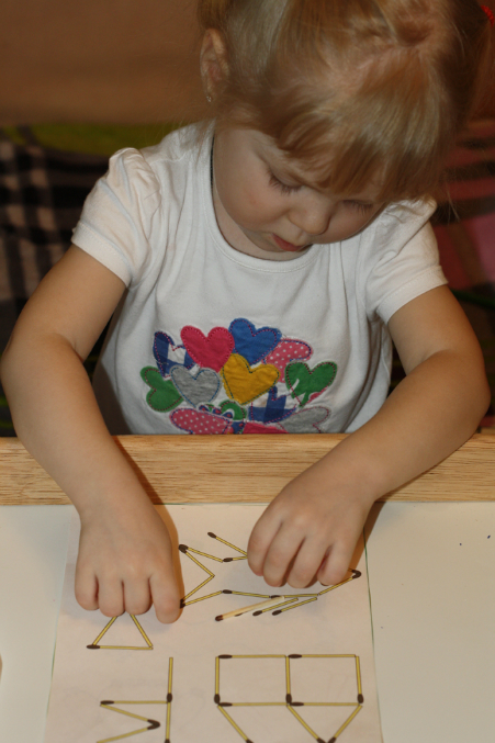 Выкладывали спичками фигуры. Соня любит корпеть над этим заданием, пока все не разложит- не считает выполненным задание.