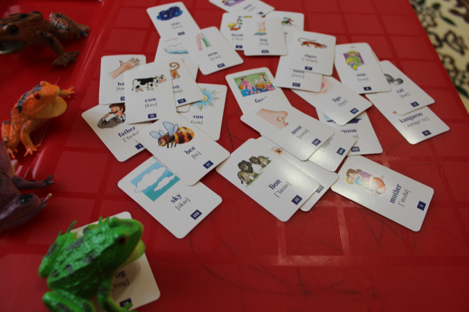 Немного английского для Алисика - сортировка карточек на 4 группы - семья, животные, погодные явления и части тела.