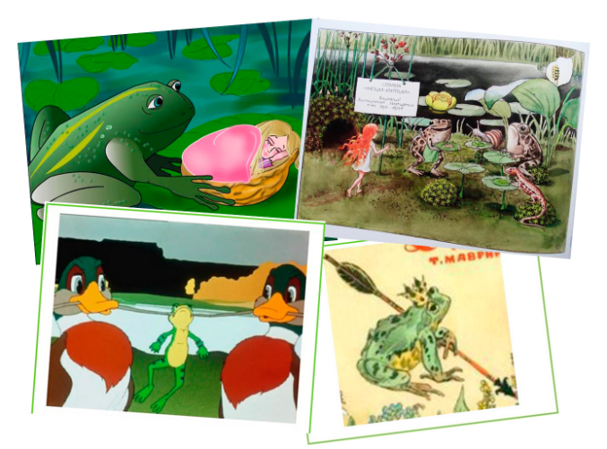 Я нашла картинки из четырх сказок: "Дюймовочка", "Царевна-лягушка", "Лягушка-путешественница", "Солнечное яйцо".