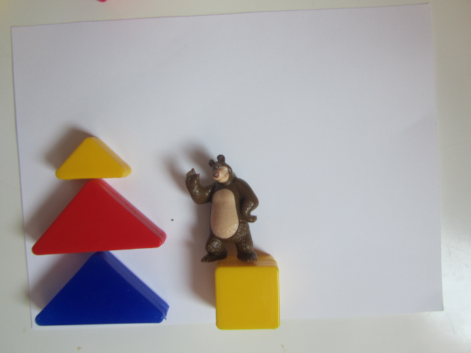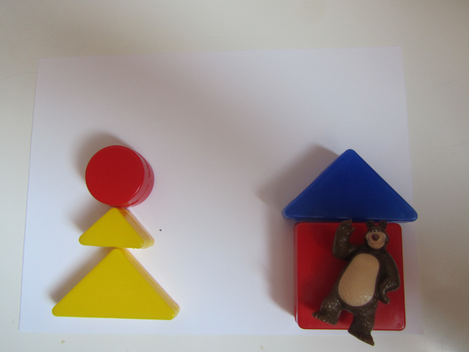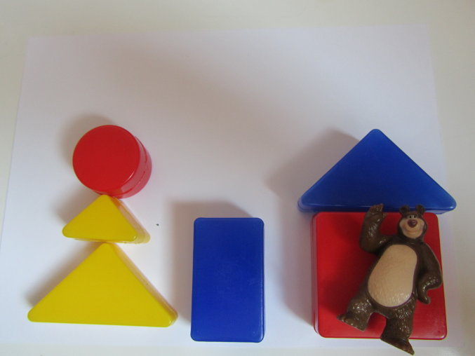 Шел он долго, пок не устал и говорит Сяду на пенек (желтый квадрат) съем пирожок, а Маша ему из короба говорит: "Не садись на пенек , не ешь пирожок, неси бабушке, неси дедушке"