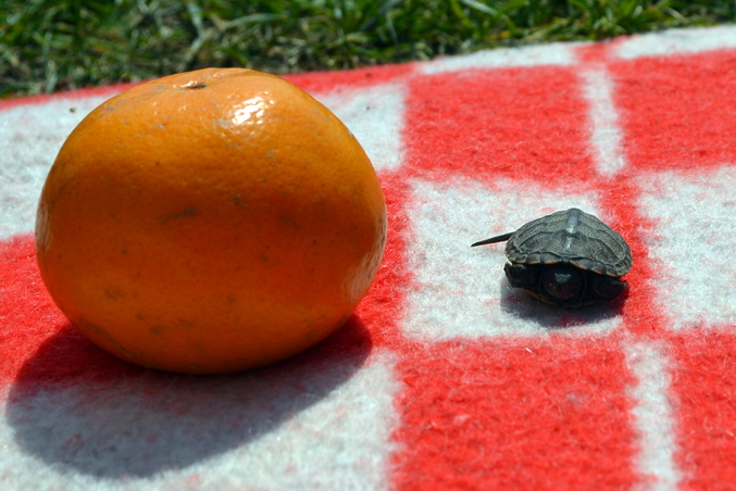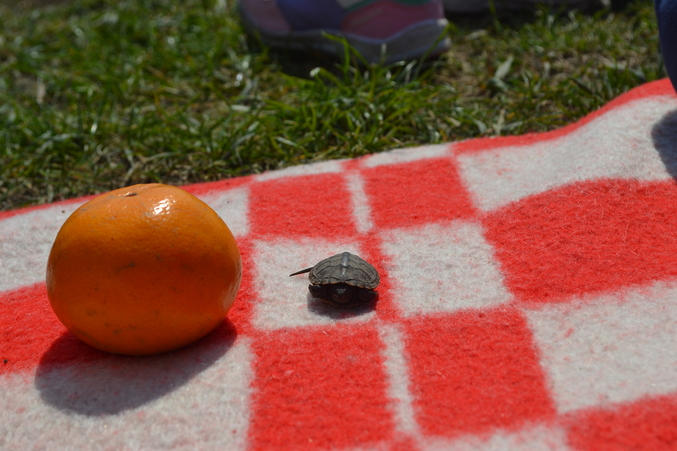 Встретили такую маленькую черепашку речную, это мандор для сравнения, на заднем плане это детский кроссовок , 23 размера, вот какая она была маленькая. Что самое ужасное мы ее нашли в куче мусора