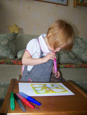 Ну и очень увлекательное действие - рисование с помощью воздушных фломастеров, т.е. в них нужно дуть и тогда краска распыляется и поверхность листа окрашивается. мне самой безумно нравится это занятие, ну и доченьке конечно тоже!