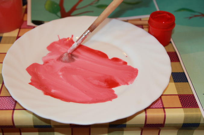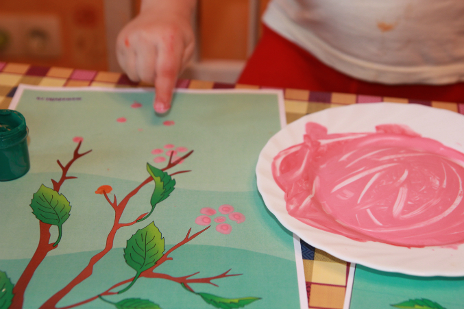 Смешивали красную и белую гуашь. чтобы получить розовую - для цветущих яблонь.