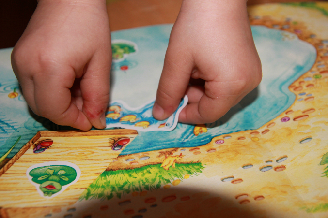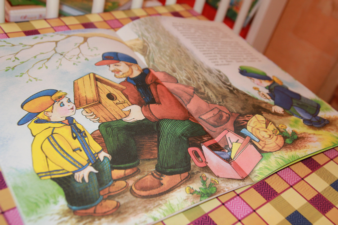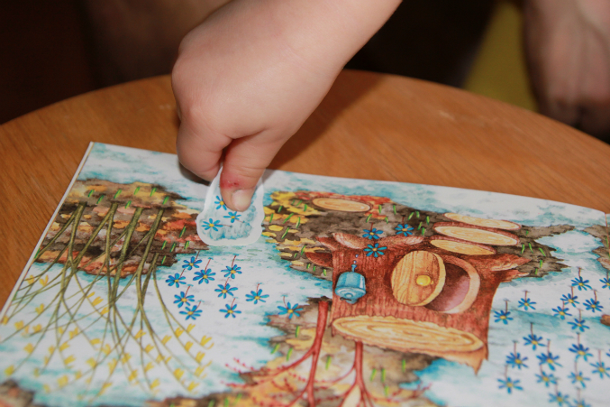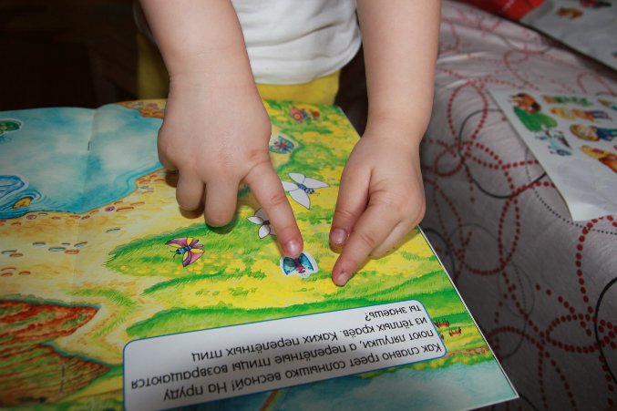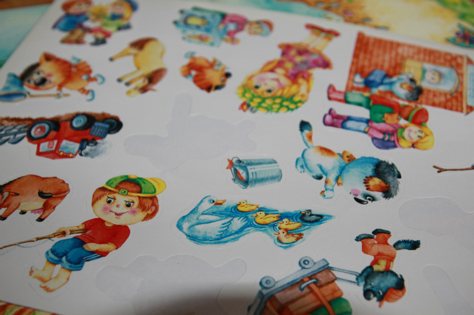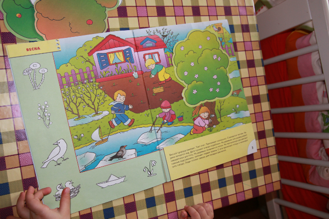 А это как раз та книга с наклейками. Тут нужно дополнить весенню картину прилагающимися наклейками. Их много, и иллюстраций и наклеек. Еще не все сделали, забыли даже)))