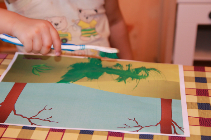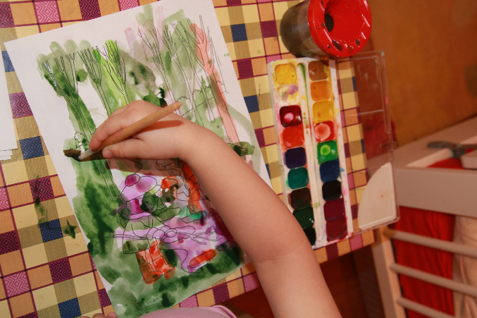 Далее акварель... Настя раскрашивает картинку на тему весна.