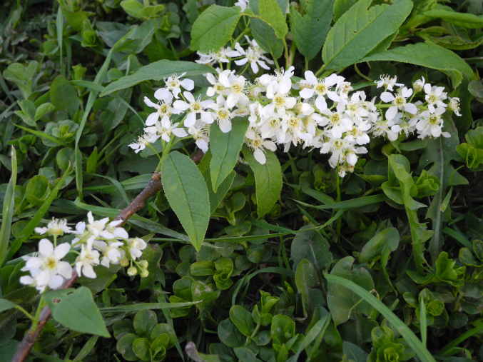Гуляя вечером по улицам дачным нашли цветущую черемуху, я сорвала веточку и дала Насте. Надеюсь, что на меня не сильно обидятся хозяева этого дерева. Мы ради познания, а не баловства.
