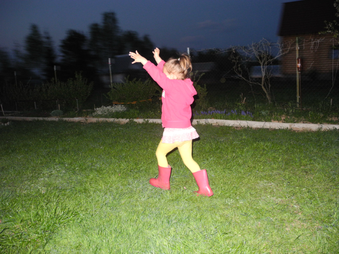 После 21 ого часа они выползали из земли и начинали разминать крылышки, учились взлетать, так смешно)) Заползают на травинку или листик , затем на 2-3 см взлетают и падают. С каждым днем все больше и больше их появлялось и уже высоко они стали летать. Настя с удовольствием за ними бегала и ловила их, но в руки боялась их взять.