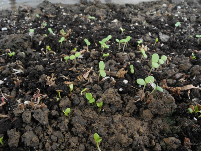Всходят астры. Наблюдаем за ростками и Настя поливает.