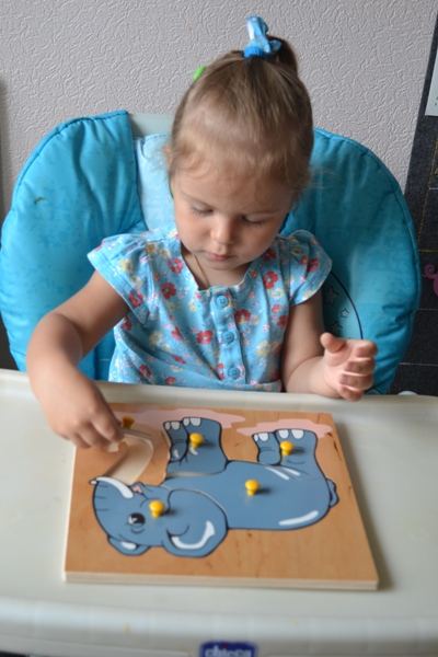 Ну и напоследок наши любимые прищепки, только немного в другом виде. Нужно подобрать хвост животному. Сначала Настюха искала хвост слону, тигру, обезьянке и льву.