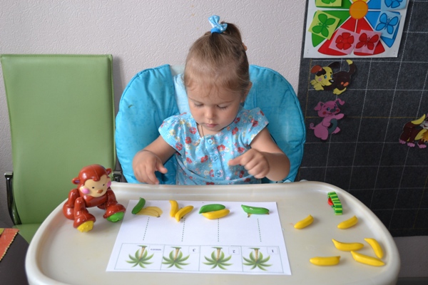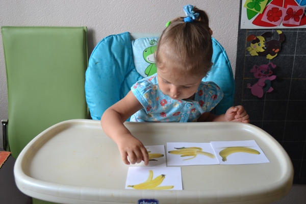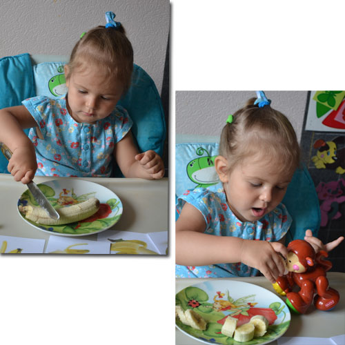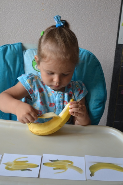 Повторили все тоже самое, но уже с настоящим бананом, постоянно возвращаясь к картинкам и комментируя, что мы делаем.