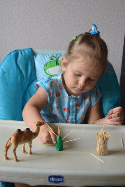 В пустынях Африки можно часто встретить колючки, вот мы ее и сделали из пластилина и зубочисток. Покормили колючкой верблюда