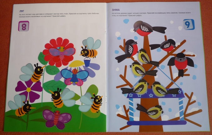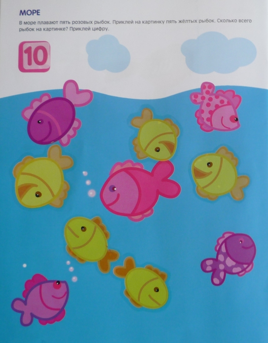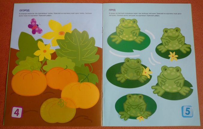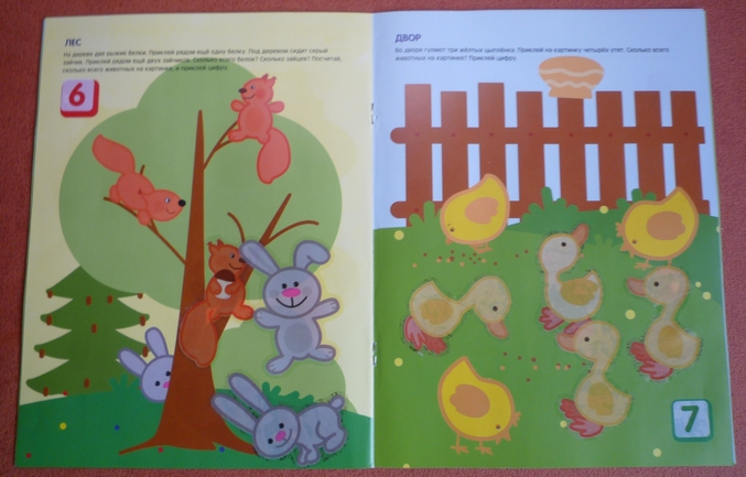 Этот альбом использовали когда дочка уже свободно считала до 10,поэтому прошли весь за одно занятие.Ребенок полностью все поклеил сам!Благодаря интересным задачкам повторили счет в пределах десяти и числа! Наклейки изготовлены на плотной прозрачной пленке,кроме чисел,они на белой пленке,но тем не менее оба вида наклеек многоразовые!