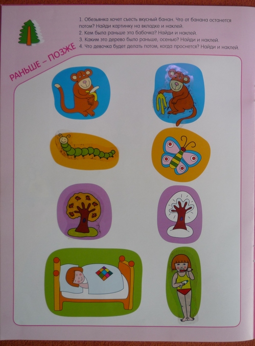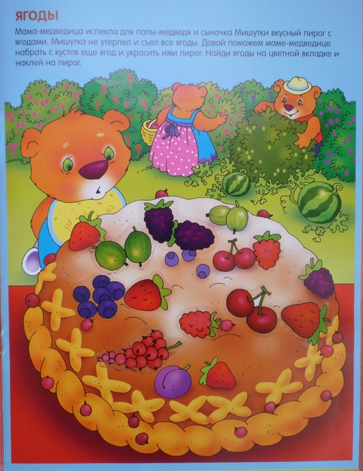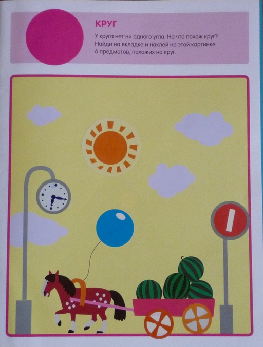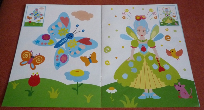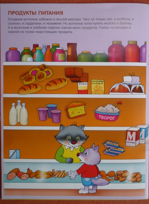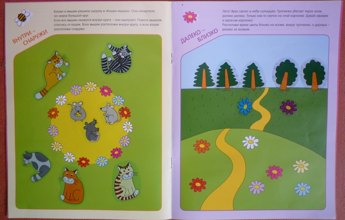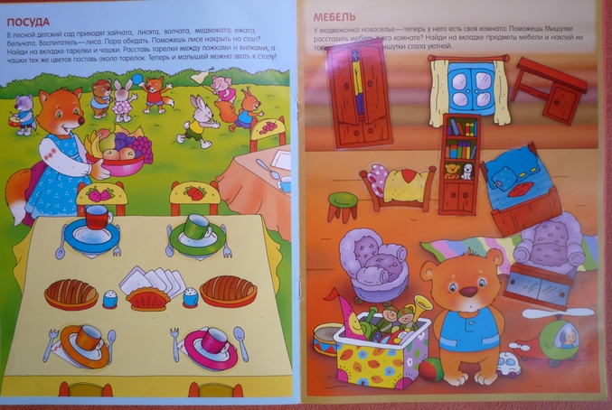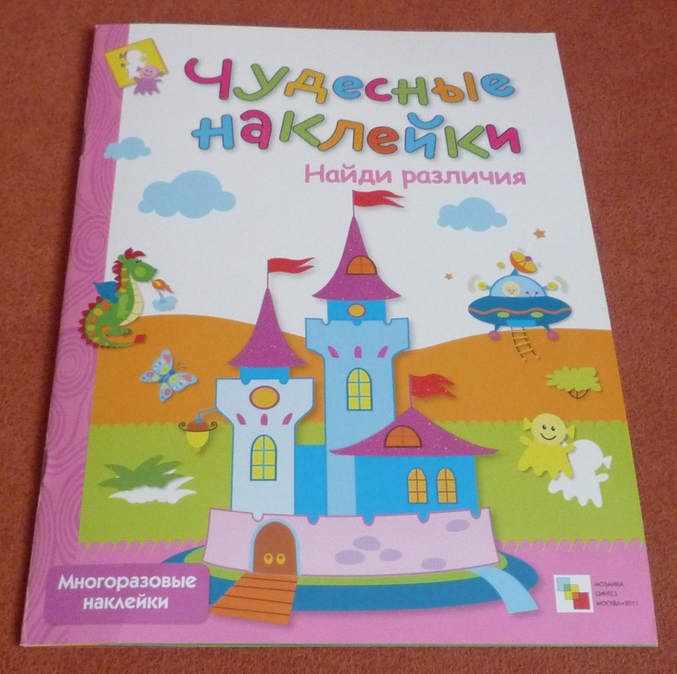 Книжка направленна на развитие внимания у ребенка.На каждой странице нарисован один предмет,а в углу маленькая его копия,но в полной "комплектации" ,ребенку предлагается обнаружить отличия и недостающие детали приклеить на рисунок-основу.Скажу честно ,дочка в три года находила 2\3 отличий,а на остальные я давала подсказки,но и с ними не всегда все получалось...Но,думаю что к годам четырем ребенок вполне способен выполнить задание без помощи мамы.