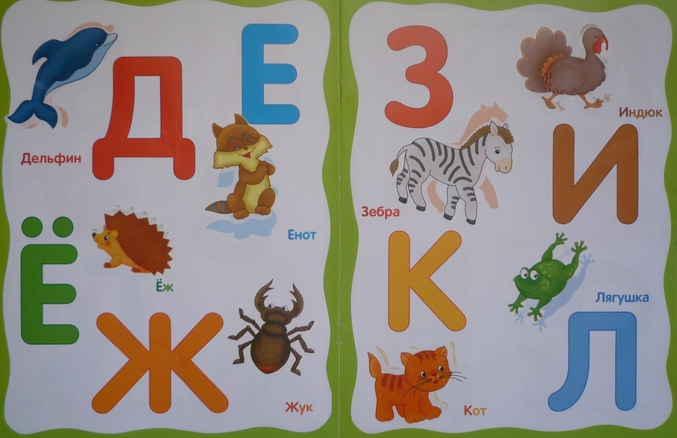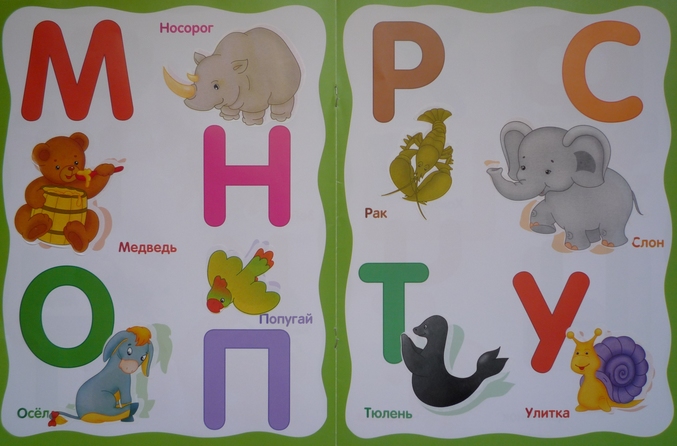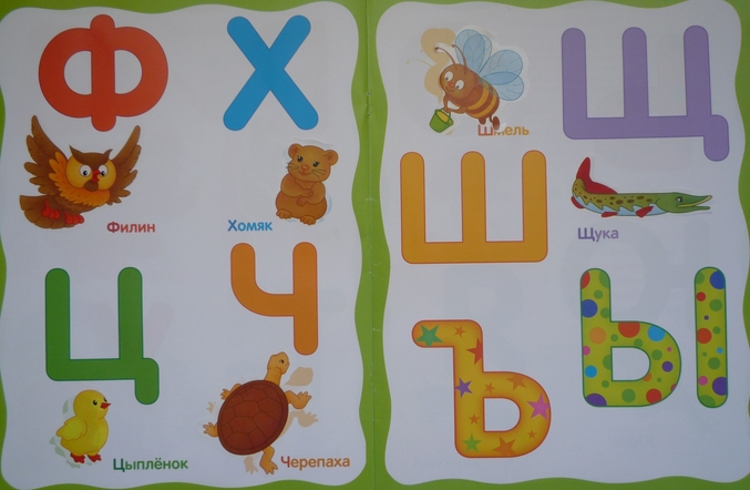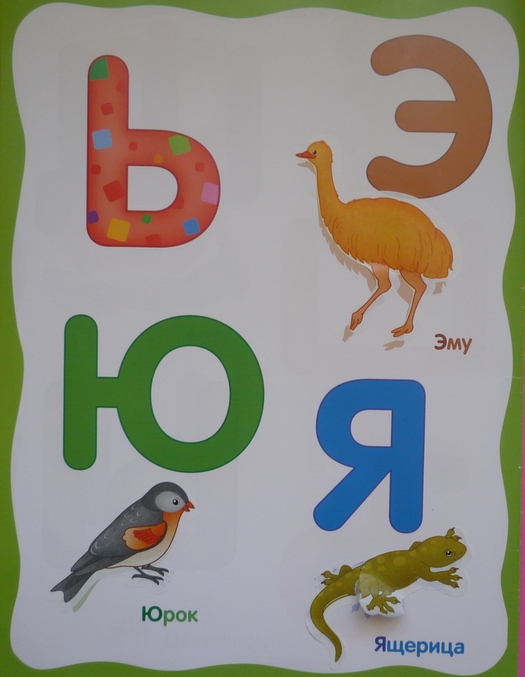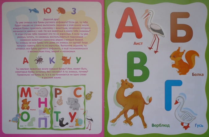 По силуэту ищем на цветной вкладке нужную картинку с изображением(начинающееся на первый звук)" брата нашего меньшего "и приклеиваем рядом с буквой,крупной и яркой(заодно цвета повторяем,а также птиц,зверей,насекомых)!Порадовало что буквы Ы,Ъ,Ь оставили без наклеек,так как нет слов,которые начинаются с этих букв,но и пропущенная буква Й от нашего взгляда не ускользнула(((