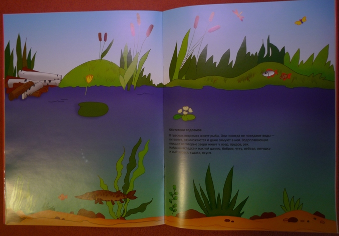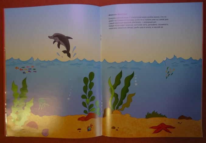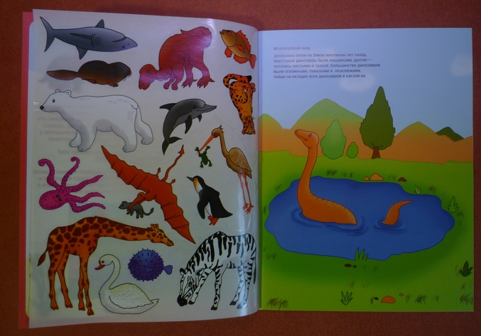 На каждой страничке приведен небольшой тематический текст,с полезной,развивающей кругозор информацией.Предлагается наклеить животных по месту их обитания:на севере(моржа,тюленя..),в водоеме(лягушку,утку...),в море( дельфина,кита..),в Африке(жирафа,зебру...),и конечно же самая любимая тема моей трехлетки -это динозавры!