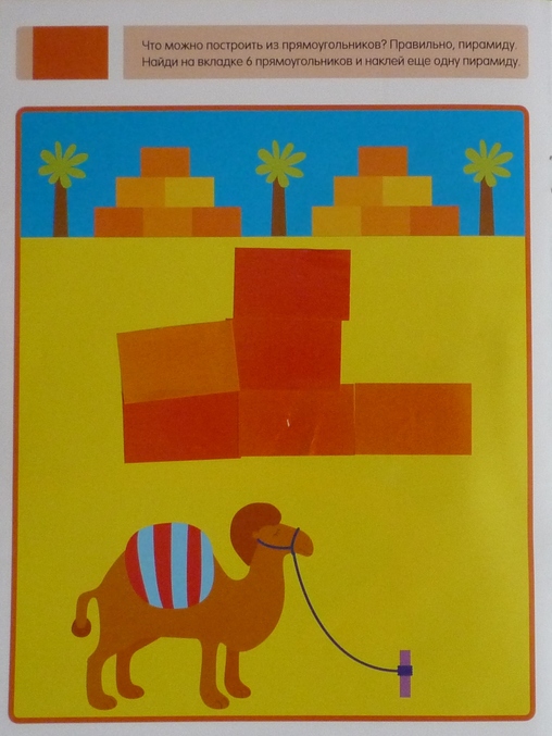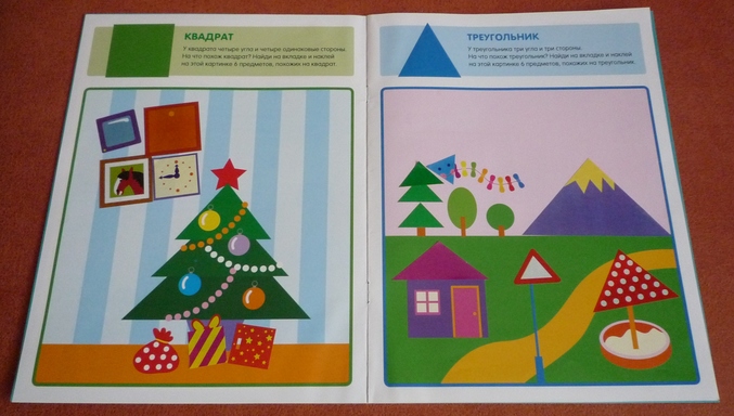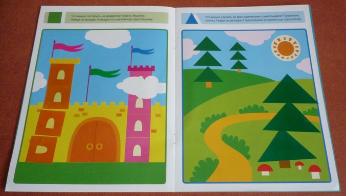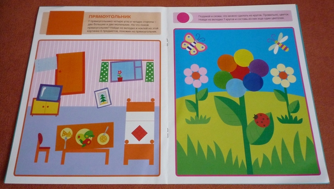 Пособие для изучения и закрепления знаний по геометрии.В игровой форме изучали и повторяли такие геометрические формы как круг,треугольник,квадрат и прямоугольник.В первых четырех заданиях предлагается на цветной вкладке найти и приклеить предметы соответствующей формы. И 4 задания на конструирование,для нас они оказались более сложными,чем первая часть. Составить из фигур цветок,башню,елочку и пирамиду. При их выполнении попутно повторяли цвета и считали(сколько и какого цвета лепестки у цветочка,из скольких этажей состоят башни и т.п)