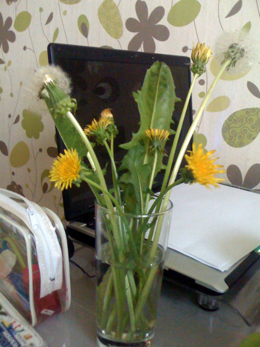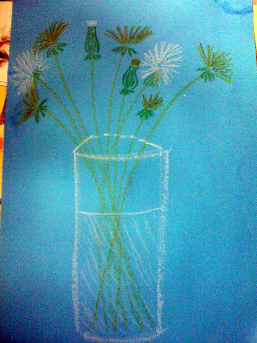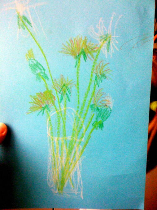 5) Пока сохла заготовка для монстриков, мы чтоб не скучать рисовали натюрморт. В процессе мы повторили какой одуванчик сначала, какой потом и как распыляется и еще тренировали счет - считали сколько раскрытых, закрытых и белых.