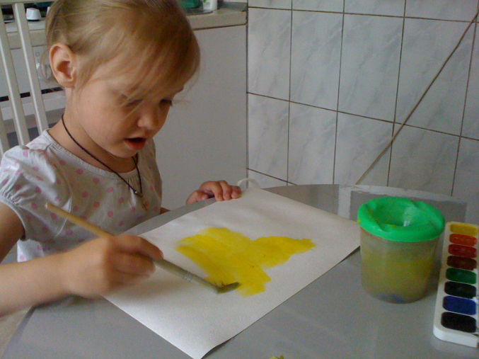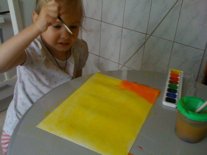 Сначала лист акварельный промокаем влажной губкой и красим полностью одним цветом светлым.