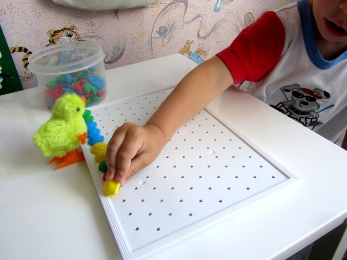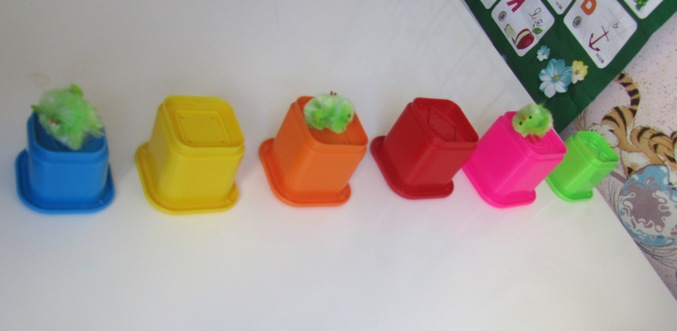 Второй вариант игры был такой, Оставляем три баночки, прячем в одну из них цыпленка при ребенке, потом ребенок закрывает глаза, а мы меняем баночки местами, просим вспомнить, где цыпленок.