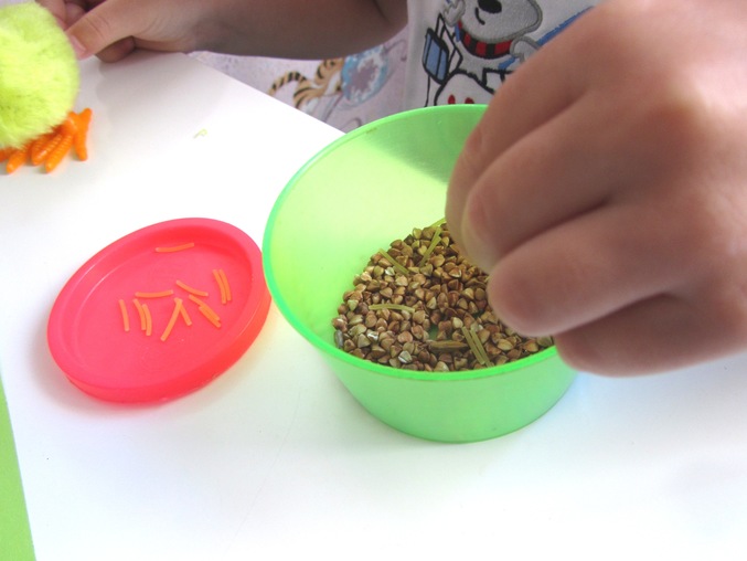 Наигравшись им, я предложила покормить Пушистика- так мы его назвали. Для этого приготовила корм из гречки и макарон (червячки) и попросила выбрать только червячков