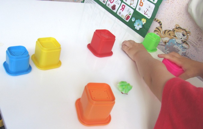 Самое интересное, что ребенок запоминает местоположение баночки, в которой спрятался цыпленок, и при вопросе ГДЕ СПРЯТАЛСЯ ЦЫПЛЕНОК первым делом тянет руку к тому месту (баночке) где изначально видел цыпленка и конечно ошибается, потому что баночки поменяли местами.