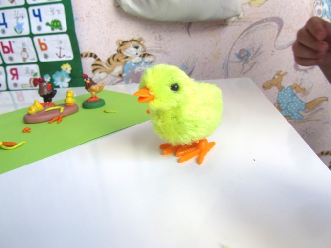 А вот и владелец перышка- желтый заводной цыпленок (новая игрушка, которую купила специально для занятия)