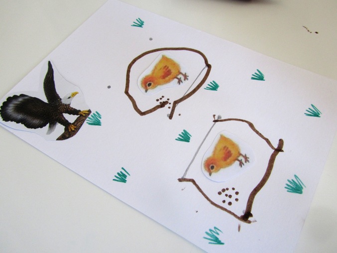 Порассуждали кто может еще утащить маленьких цыплят (Кошка, Лиса- это ответ Кирилла), я добавила и предложила спасти цыплят от Орла