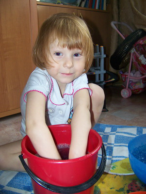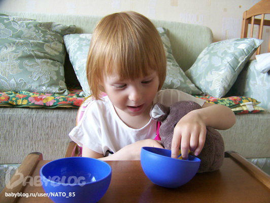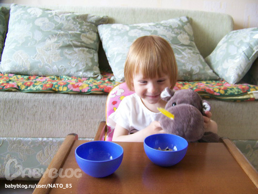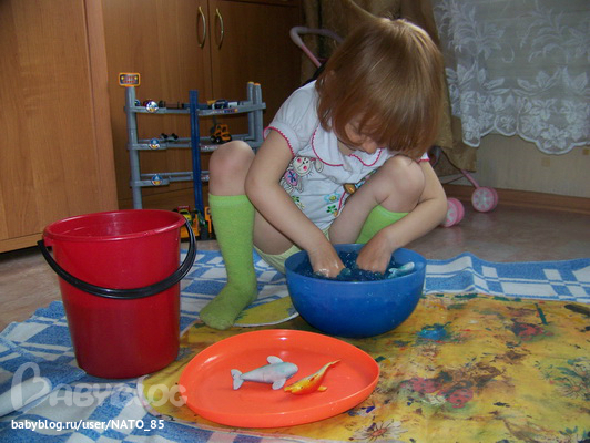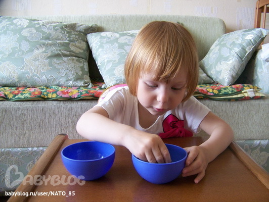 Это занятие у нас было практически перед самым сном вечерним, так как родителям нужно было спокойно собирать вещи в предстоящую поезду, а с Лизой это задача усложняется раз в 10... Так что хитрая мама выдала миску с чем-то интересно-болтающимся и все - ребенка не видно неслышно минут 30-40!!! Наша с мужем задача была только по требованию менять теплую водичку)))