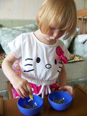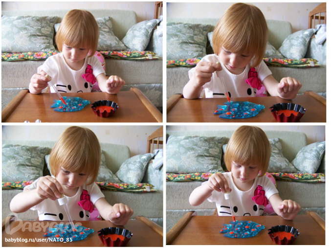 Зато с пипеткой Лиза долго занималась - снова и снова! Причем получается и довольно хорошо, правда иногда забывается и водичка обратно в пипетку набирается)))