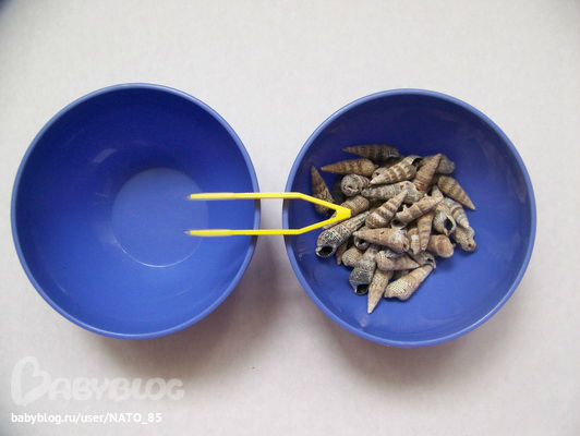 2. Работа с пинцетом - перекладываем ракушки из одной мисочки в другую