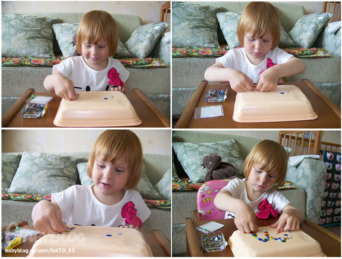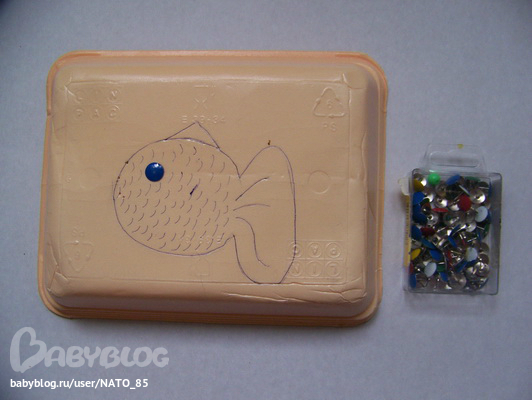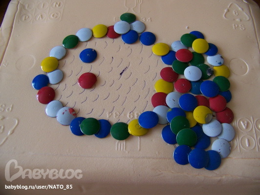 Любит моя крошка канцелярские кнопки, но прежние задания с подбором цвета нам наскучили, так что сегодня задание творческое - нужно рыбку выложить по контуру - разукрасить!