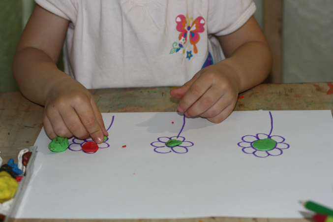 Нарисовала от руки цветочки, дочка обклеивала их пластилином. Катала сначала шарики, потом украшала ))) Ц