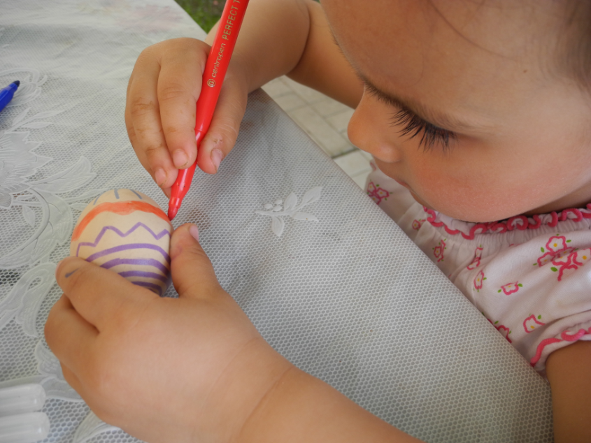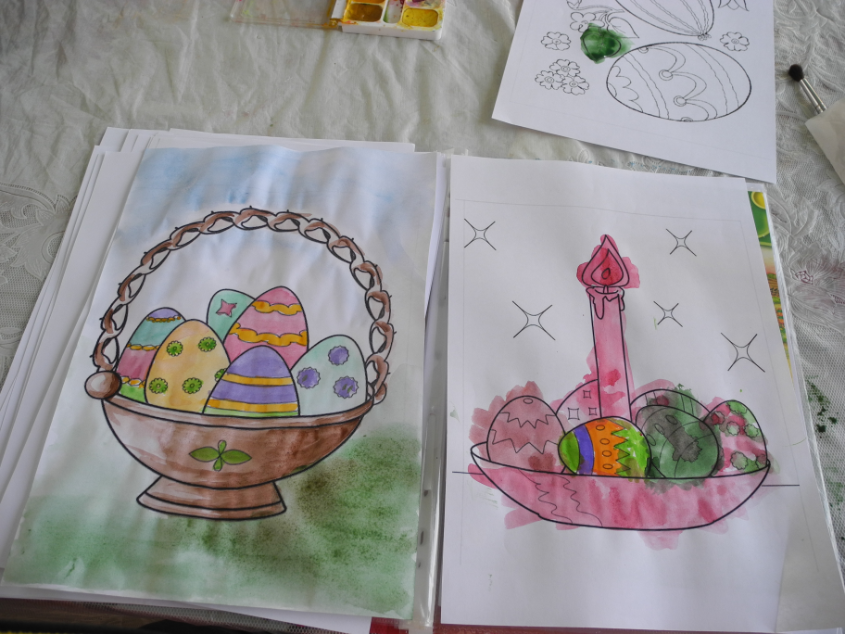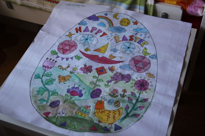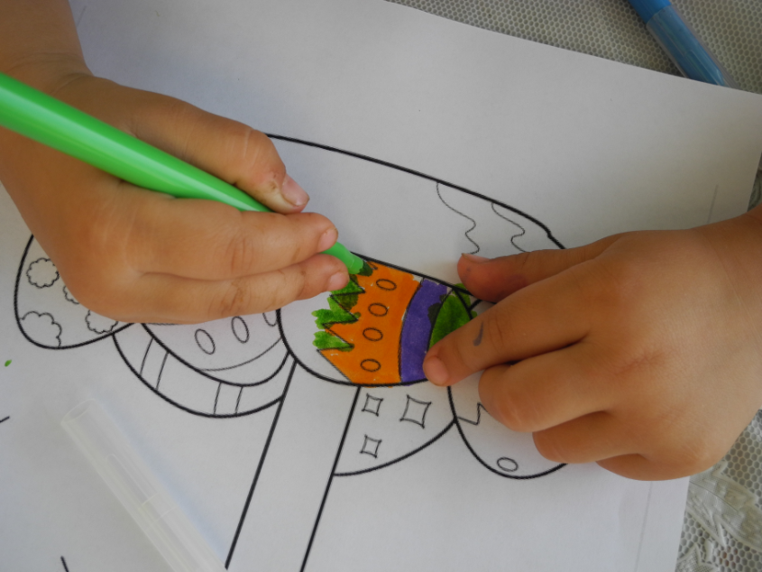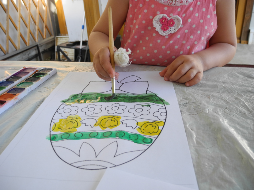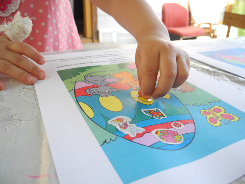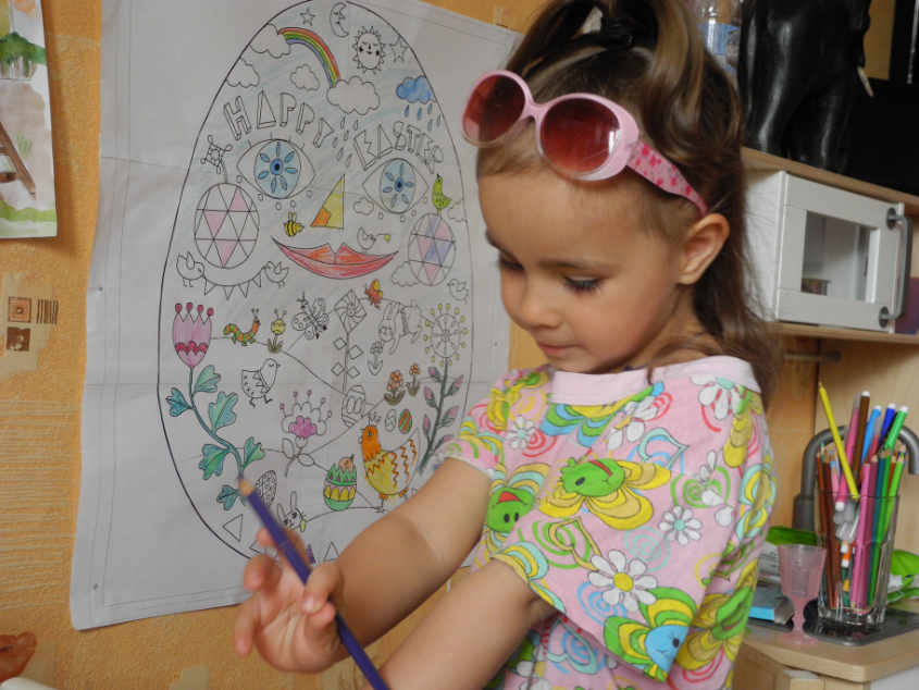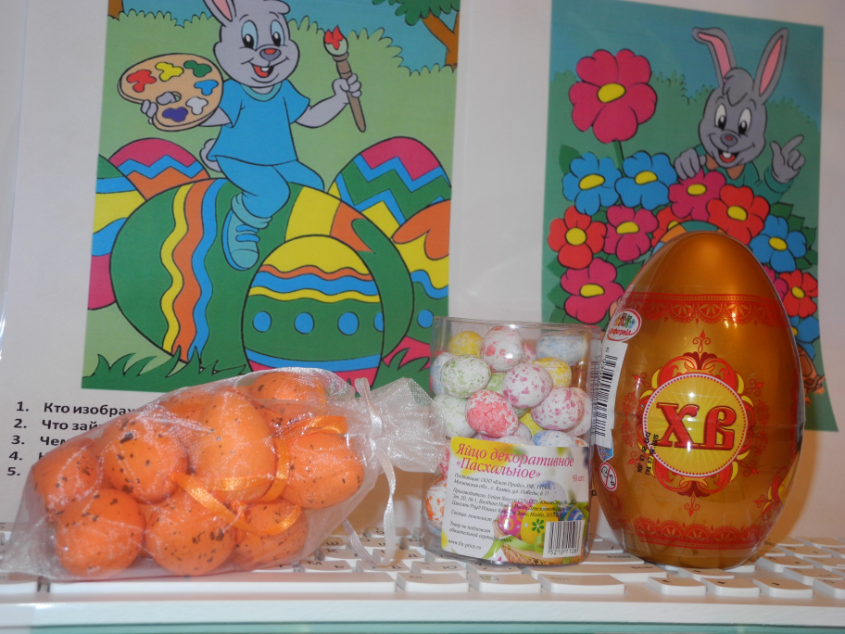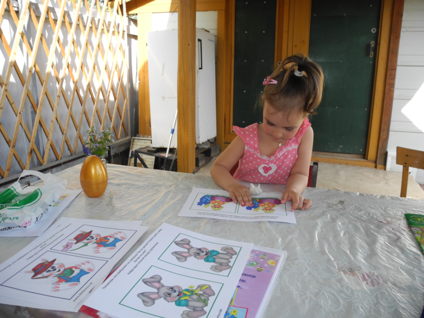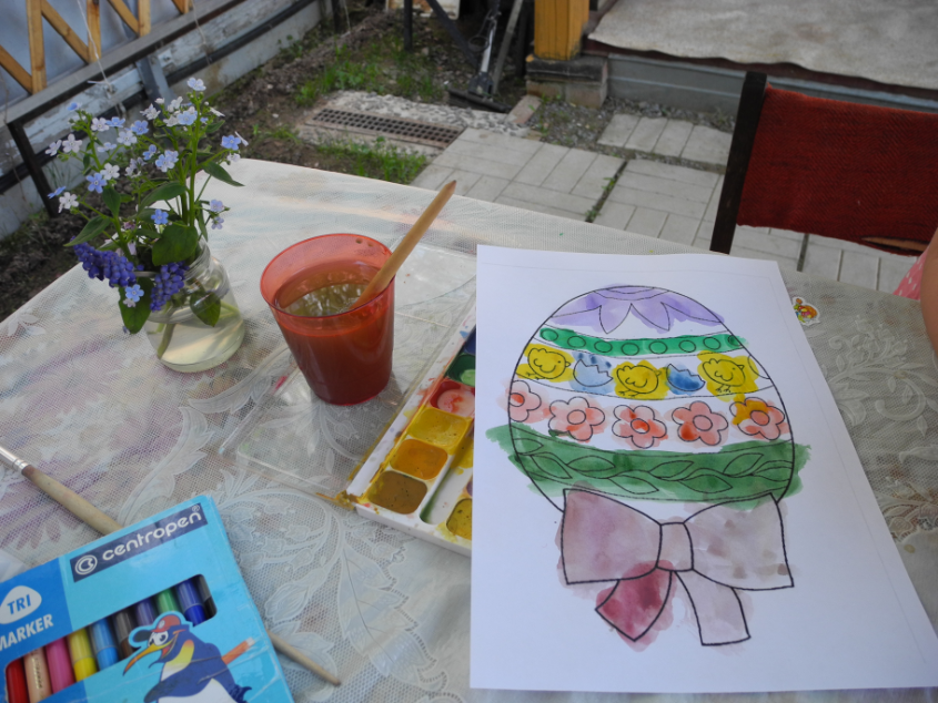 Привезла на дачу немного материла. Картинки от Натальи (detidoma.net), яйца мелкие и яйца с петелькой из фикс-прайса, яйцо большое с сюрпризом и конфетками + раскраски, акварель, карандаши... Далее в это яйцо мы складывали маленькие разноцветные яички.