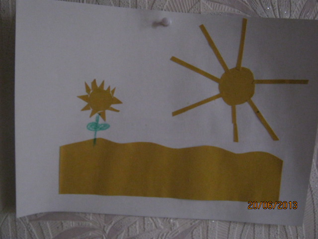 5. Делали аппликацию на нашу радугу. Сема усердно занимался клеем, я делала все остальное. Мне понравилось. Семе тоже, он не хотел расставаться с клеем и требовал вернуть его назад. Дотребовался. Пришлось делать еще одну аппликацию. Делала пустыню, а там подсолнух. Все желтое. Сема мазал клеем, который я потом потихоньку спрятала.