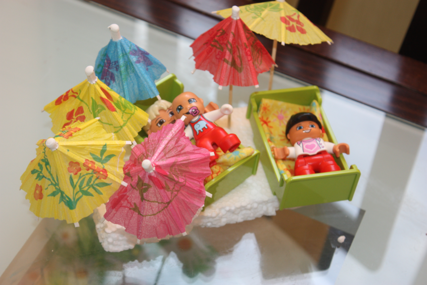 Тренировали пальчики, втыкали зонтики в импровизированный пляж. чтоб прятаться куколкам от солнышка