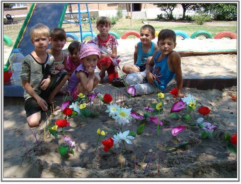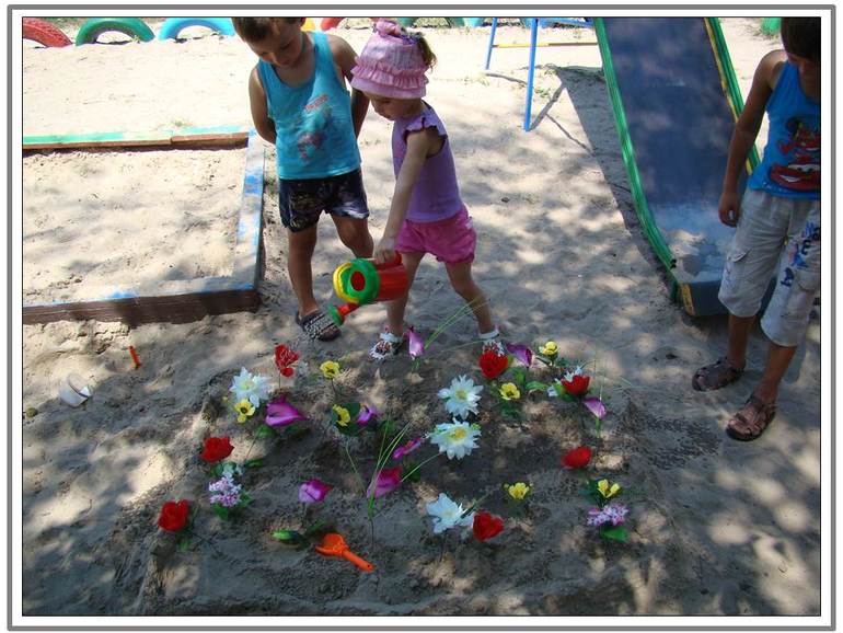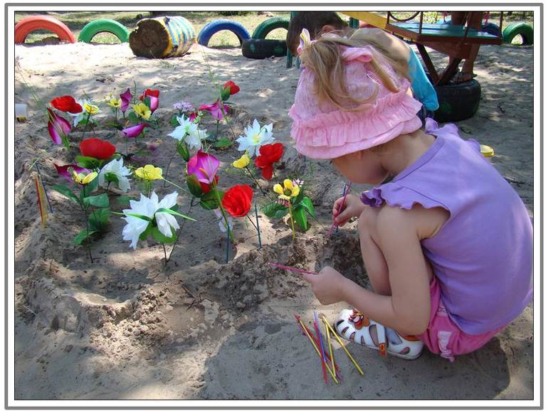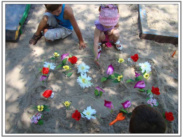 Физическое развитие и подвижные игрыЯ думаю, у многих летние прогулки сопровождаются играми в песке. Мы не исключение, правда, Даша никогда не любила просто возиться с песком – насыпать и высыпать, ей всегда нужно что-то новенькое придумывать. Вот появилась у нас новая забава– сажаем клумбу в песочнице!