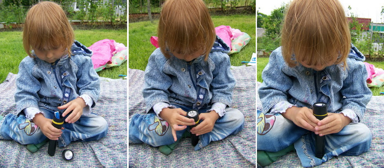 Вставляем батарейки (я правда показала, какой стороной нужно вставлять, чтобы свет потом появился), надеваем крышку, закручиваем. И, о чудо, нажимая кнопку появляется свет! Не думала я, что у ребенка будет столько радости, вроде и фонарик видит не в первый раз, но радости то было!!!