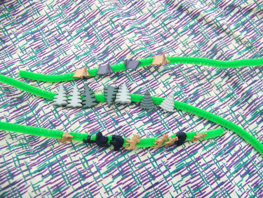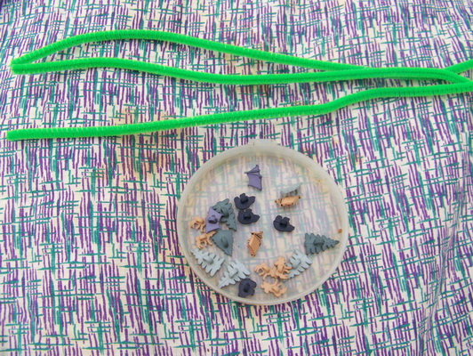 Задание такого плана у нас уже были, просто меняю пуговки с определенной тематикой. Сегодня задача стояла сначала отсортировать пуговки по группам - палатки, животные и деревья, а затем каждую группу нанизать на проволоку.