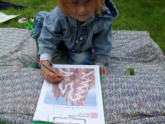 А когда увидела задание со скалами и ползающими по ним человечками, так вообще воодушевилась! Сразу сказала, что это ее дядя Андрей опять по скалам лазит (он у нас скалолаз)! Вела его очень старательно и обещала подарить картинку при встрече)))