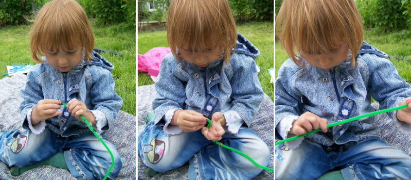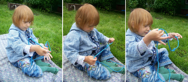 Но больше Лизу впечатлило то, как мама ловко с такой же веревочкой как у нее вязала массу интересных по ее словам петелек)))