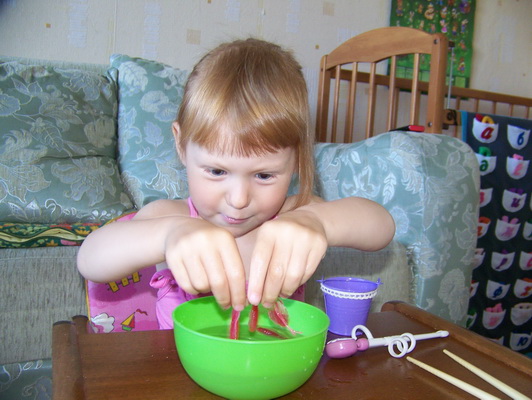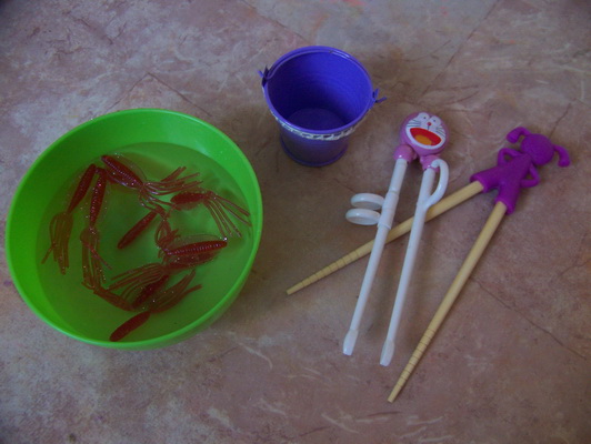 Давненько что-то мы с Лизой не доставали палочки, нужно исправляться! Нужно палочками выловить из моря всех кальмаров и поместить их в наше ведерко. Готовя это задание я предполагала, что Лизе понравится, но не думала что настолько…