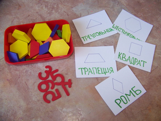 Вспоминаем названия геометрических фигур и сортируем детальки по группам.