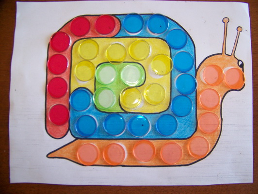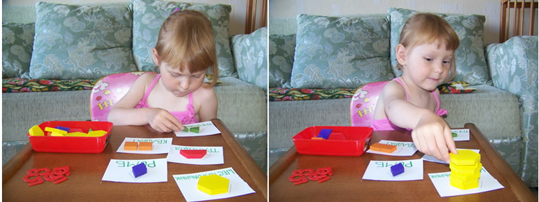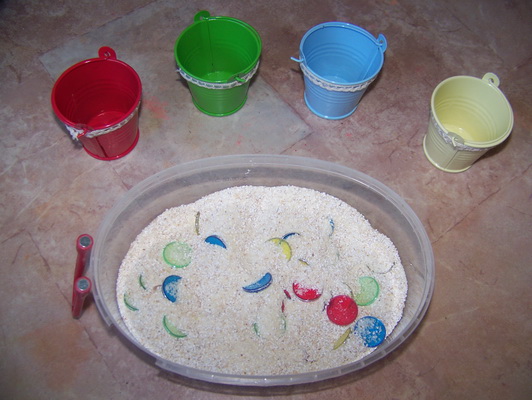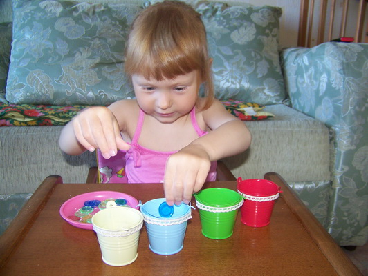 Когда задача была выполнена мы перешли ко второй части – сортировке по цветам. Раскладываем кружки в ведерки такого же цвета.