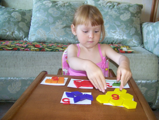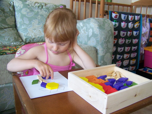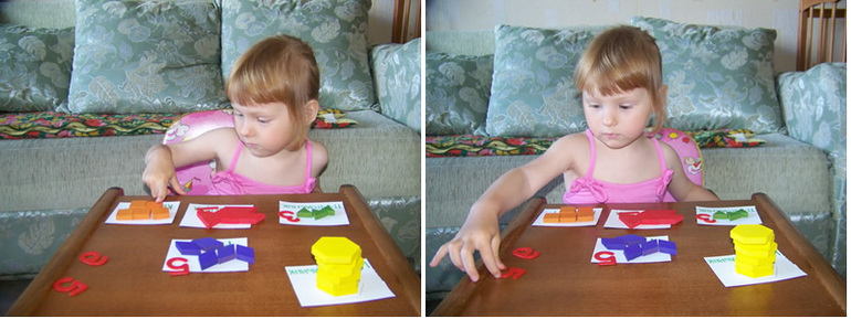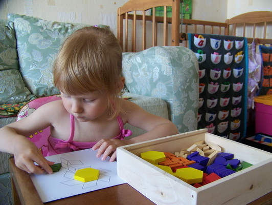Последнее время стала замечать за Лизой, что ей нравится «рисовать» картинки с помощью фигур. Решила порадовать ребенка и приобрела замечательный конструктор! Мы прям от него без ума. Детали деревянные и их много! В наборе были еще карточки двухсторонние – на одной стороне картинка с разлинованными деталями, а на обратной стороне та же картинка, только без разлиновки, т.е. просто контур. Таким образом ребенок может собирать картинку не по шаблону, а из тех деталей, которые он сам выберет. Сегодня собирали цветочек для мамы)